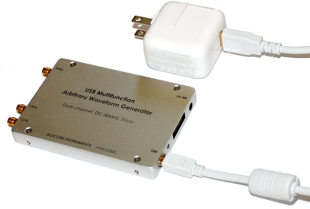 When powered by a single DC 5V power supply, AWG2300 automatically updates the output waveforms using user defined frequency, amplitude and other waveform parameters.